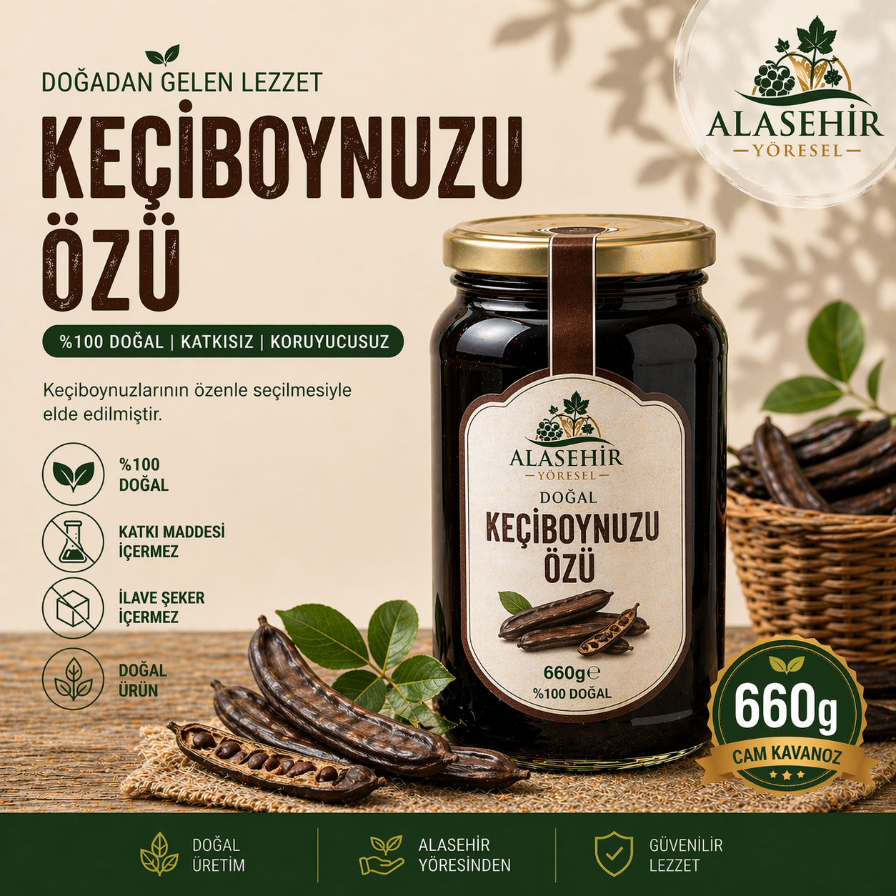 Alaşehir Yöresel Keçiboynuzu Özü; katkı maddesi, ilave şeker ve koruyucu içermez. Kendine has aroması ve doğal lezzetiyle kahvaltılarda, tatlılarda ve günlük tüketimde güvenle tercih edilir.