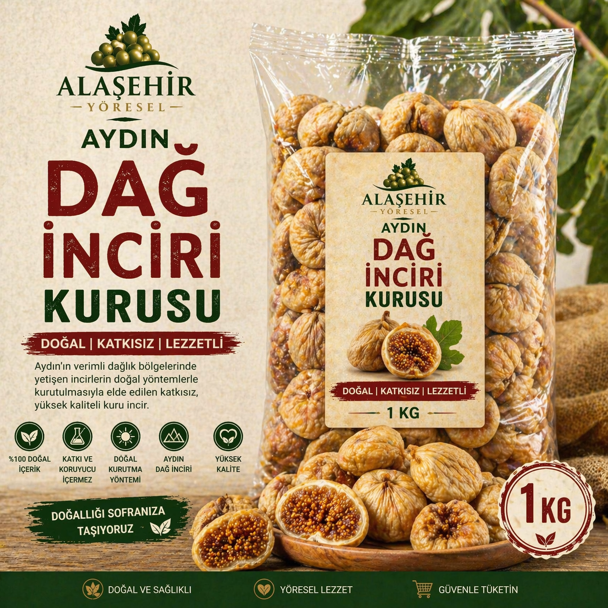 Alaşehir Yöresel Aydın Dağ İnciri Kurusu, Aydın’ın verimli dağlık bölgelerinde yetişen iri, dolgun ve kaliteli incirlerin özenle seçilip doğal yöntemlerle kurutulmasıyla elde edilir. İnce kabuklu yapısı, bol ballı iç dokusu ve yoğun aromasıyla üst segment bir kuru incir deneyimi sunar.